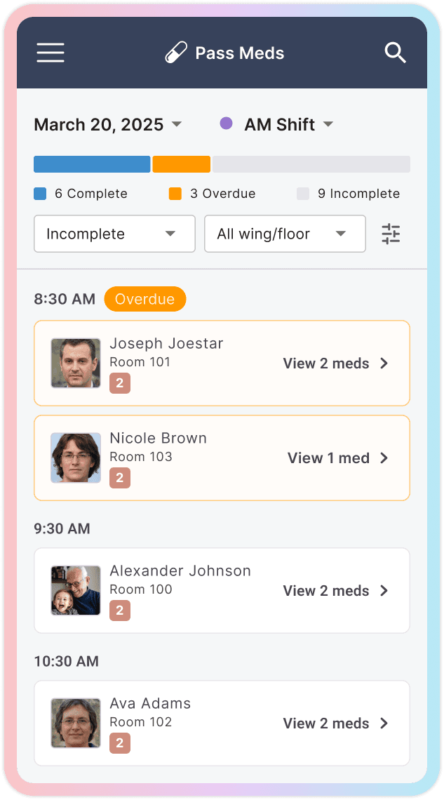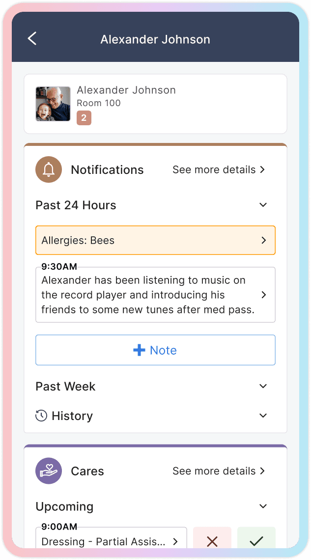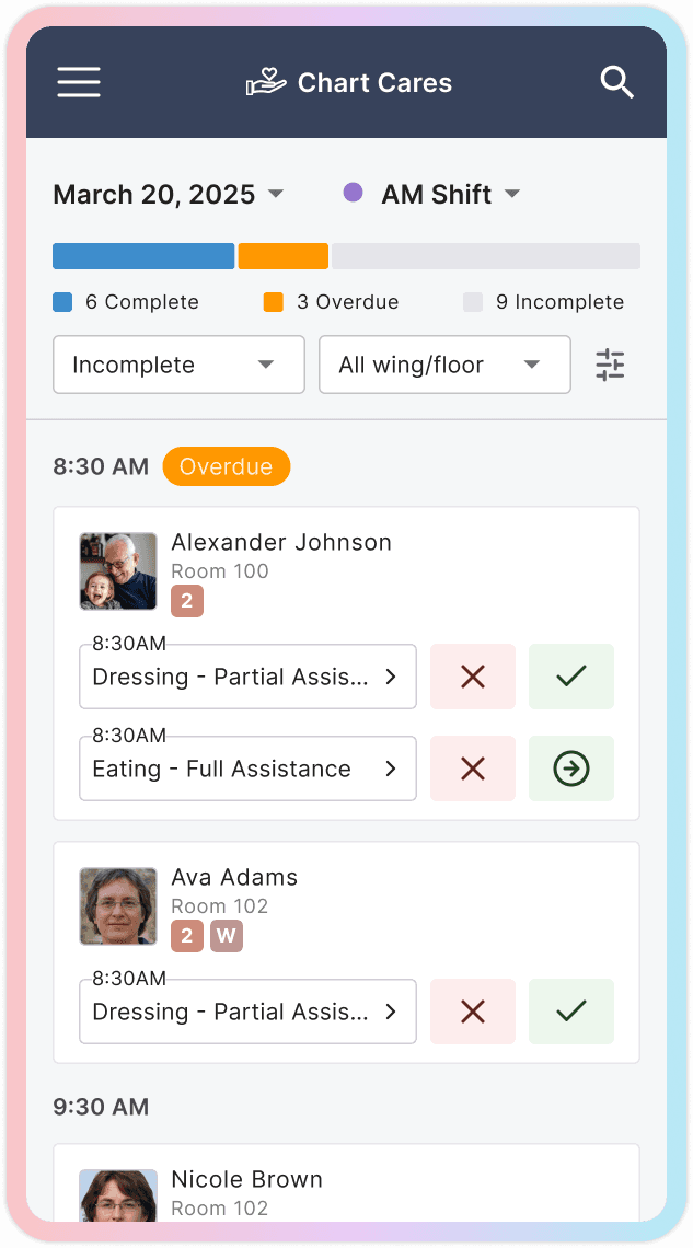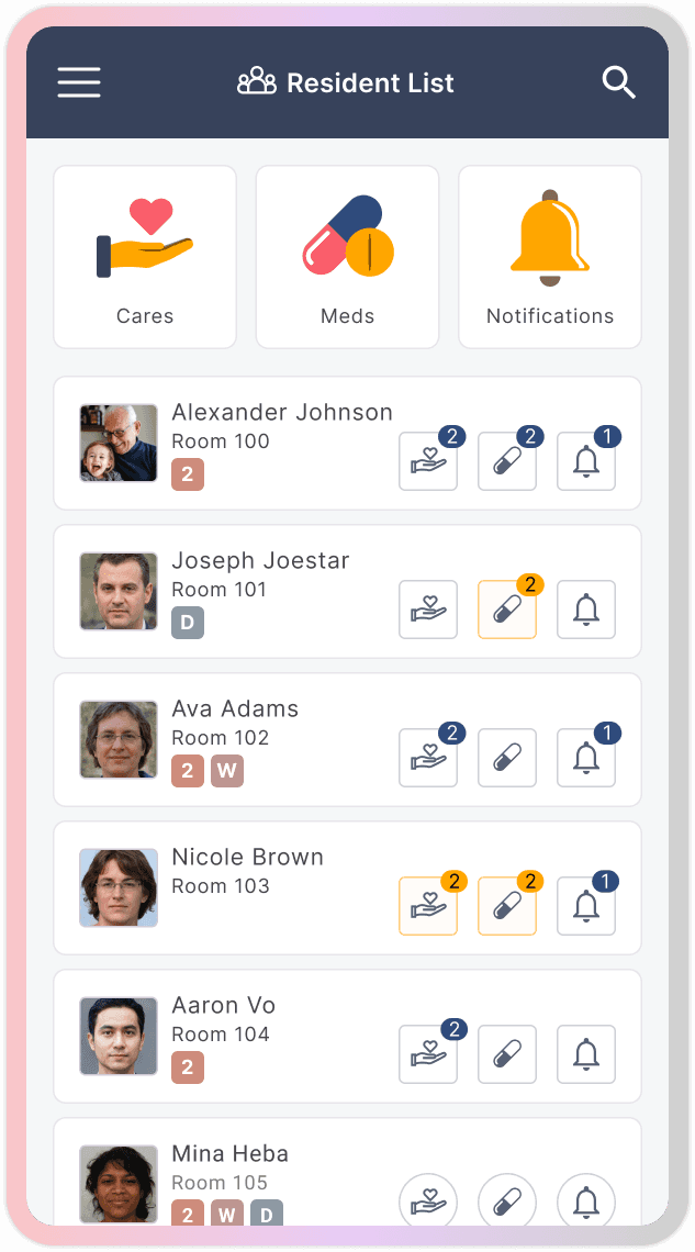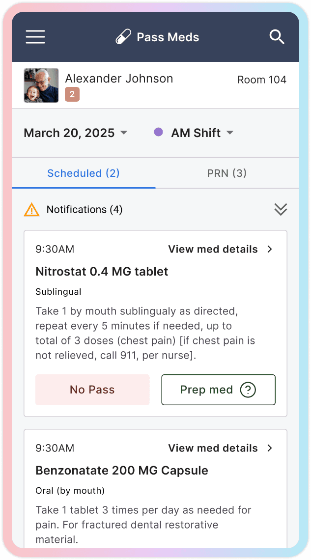 This created an opportunity to design a true mobile-first experience for core caregiving tasks. The new interface focused on three high-frequency actions: reviewing notifications, charting cares, and completing medication passes. Each flow was streamlined to reduce steps and surface the most relevant information quickly, allowing caregivers to document work in real time rather than hours later.