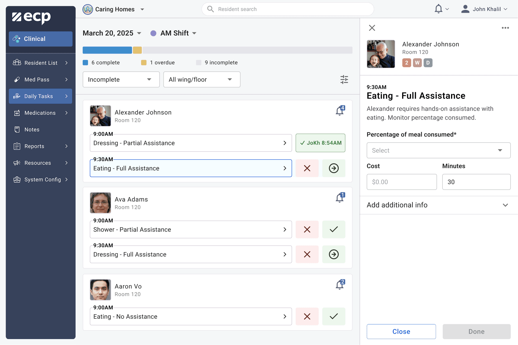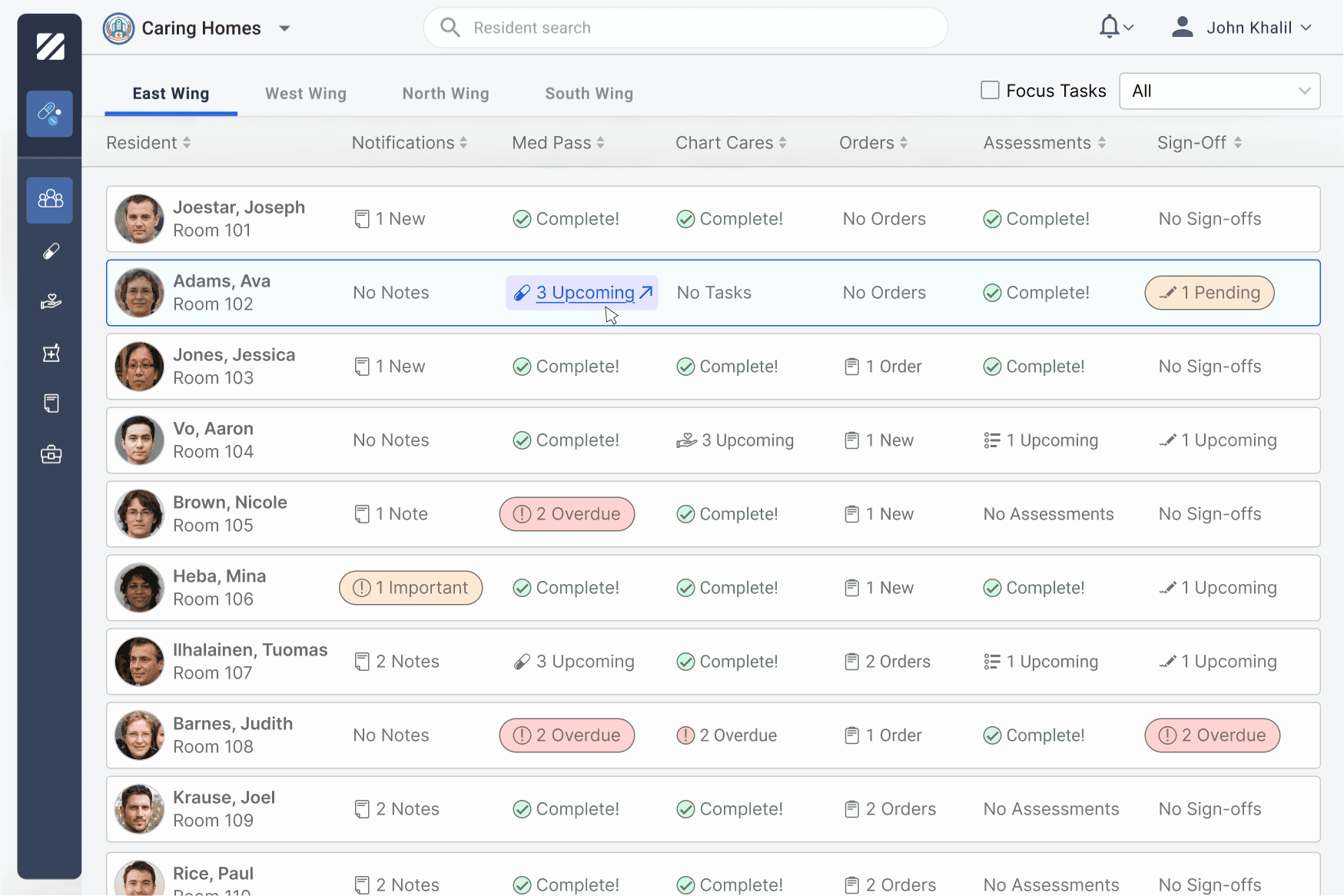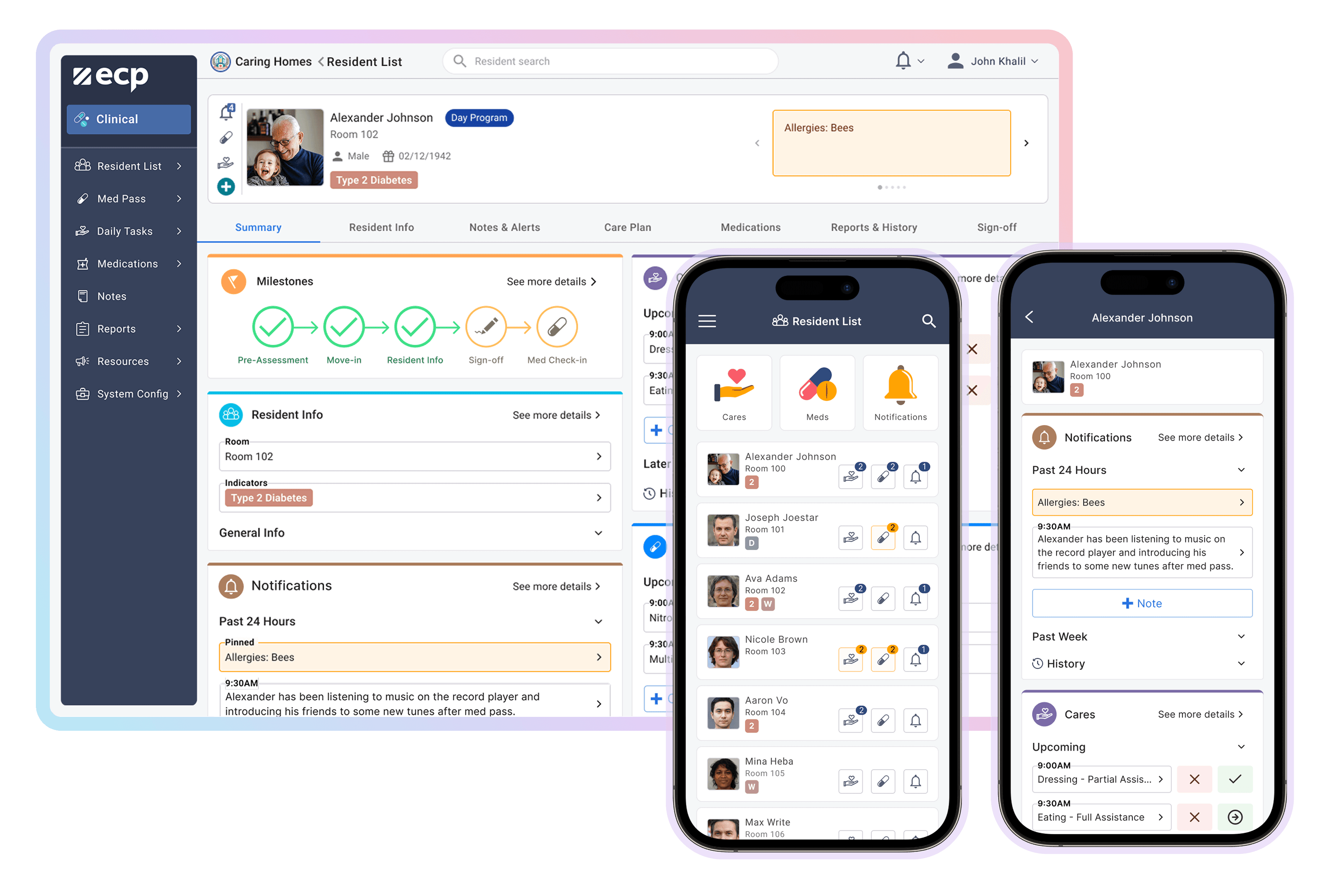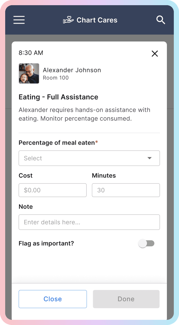 This created an opportunity to design a true mobile-first experience for core caregiving tasks. The new interface focused on three high-frequency actions: reviewing notifications, charting cares, and completing medication passes. Each flow was streamlined to reduce steps and surface the most relevant information quickly, allowing caregivers to document work in real time rather than hours later.