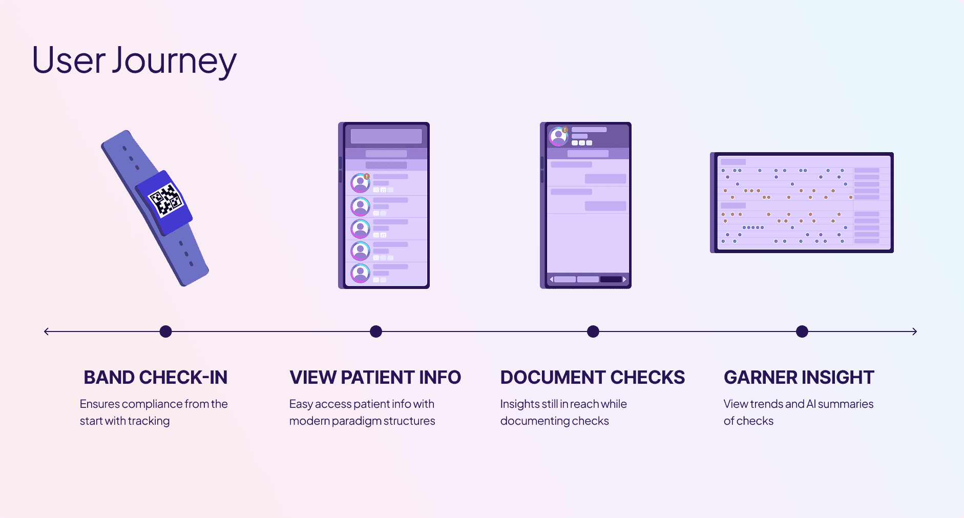 To meet hospital demands, we worked on a project over the course of two years, researching, designing, implementing, and testing a workflow where patients could wear bluetooth-enabled wristbands to verify technician presence during documentation.